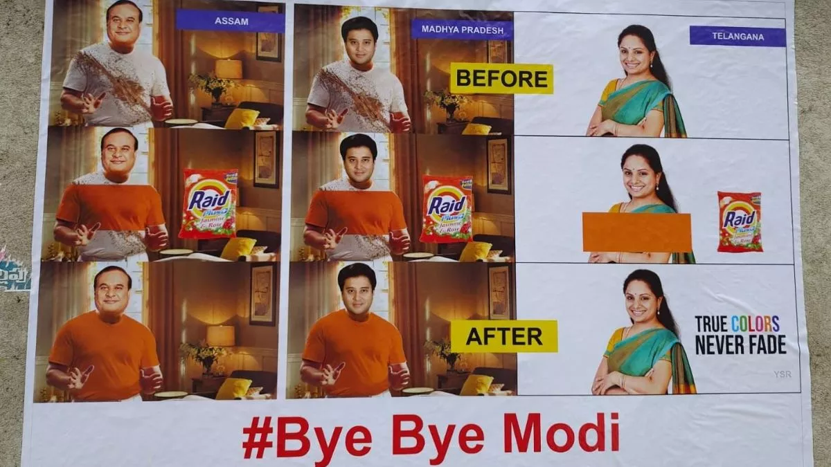 हैदराबाद की सड़कों पर लगे पोस्टर में केंद्रीय मंत्री और एमपी से नेता ज्योतिरादित्य सिंधिया, असम के सीएम हिमंत बिस्वा सरमा, महाराष्ट्र के नेता नरायण राणे, पश्चिम बंगाल के नेता सुवेन्दु अधकारी की फोटो लगी है। पोस्टर में दिखाया गया है कि ये सभी नेता ईडी-सीबीआई की रेड के बाद दूसरी पार्टियों से भाजपा में आ गए और इनके दाग धुल गए।