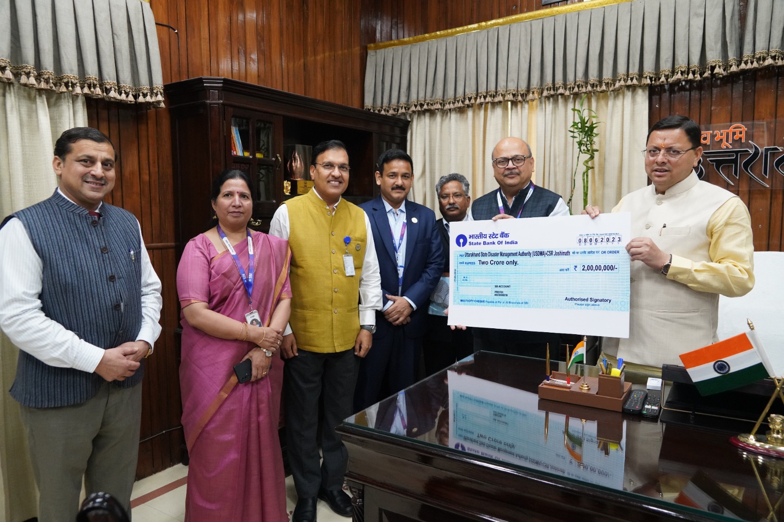 मुख्यमंत्री श्री पुष्कर सिंह धामी से मुख्यमंत्री कैम्प कार्यालय में भारतीय स्टेट बैंक, नई दिल्ली मण्डल के मुख्य महाप्रबंधक श्री कल्पेश कृ. अवासिया ने भेंट कर 02 करोड़ रूपये का चेक सौंपा। मुख्यमंत्री ने प्रभावितों की सहायता के लिए इस सहयोग राशि के लिए भारतीय स्टेट बैंक का आभार व्यक्त किया। मुख्यमंत्री ने कहा कि राज्य के चिन्हित चार वाइब्रेंट विलेज माणा, नीति , मलारी एवं गूंजी में अवस्थापना विकास से संबंधित अनेक कार्य किये जाने हैं, इसके लिए भी उन्होंने एस.बी.आई से सहयोग की अपेक्षा की।